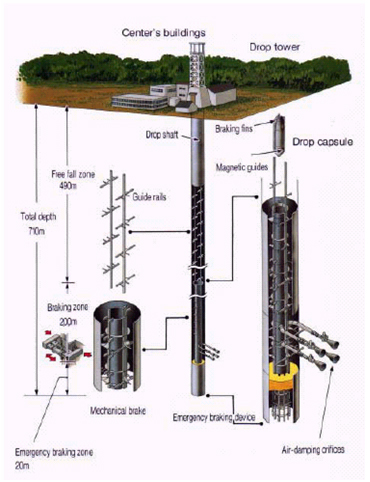JAMIC, the Japanese Microgravity Center in Kamisunagawa, Japan, is shown in the photograph at the left. Below the photograph is a diagram of JAMIC drop shaft which provides 10 seconds of microgravity.