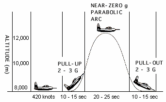 Aircraft can fly in parabolic arcs to achieve longer period of microgravity of 20 to 25 seconds with g-level of +/- 0.02 g. The airplane climbs rapidly until its nose is about 45-degree angle to the horizon then the engines are cut back. The airplane slows; the plane remains in free fall over the top of the parabola, then it nose-dives to complete the parabola, creating microgravity conditions.
